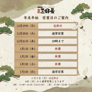いつも三好屋をご利用いただき、本当にありがとうございます。早いもので、今年も残りわずかとなりましたね。 三代目として店を継ぎ、至らぬ点も多い私ですが、皆様の「美味しかったよ」というお言葉に支えられ、今年も無事に年末を迎え […]